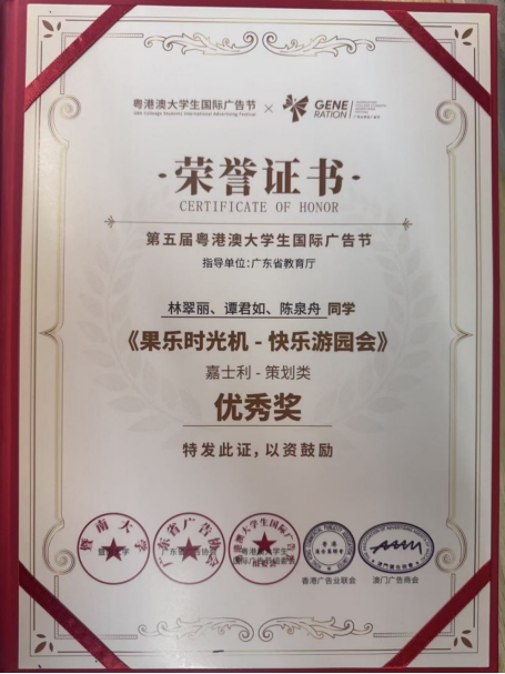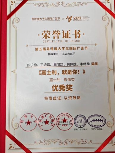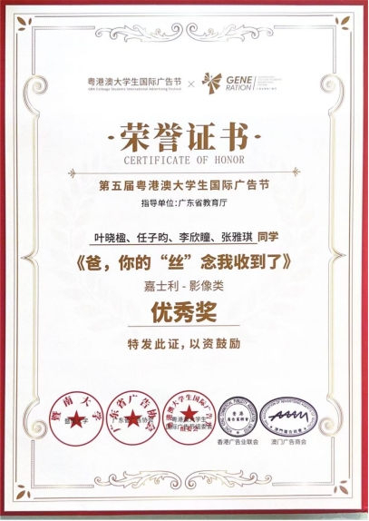 近日,第五届粤港澳大学生国际广告节颁奖典礼在广州落下帷幕。在这一届比赛中,文传学子依旧发挥出色,获得了策划类铜奖一项(获奖学生:崔芯宇、黎书语、陈希琳、王紫怡)、影像类优秀奖两项(获奖学生:叶晓楹、任子昀、李欣瞳、张雅琪;陈乐怡、王培斌、周明欢、黄佩媛、韦继承)、策划类优秀奖一项(获奖学生:林翠丽、谭君如、陈泉舟)