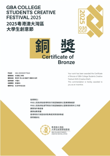 此外,在稍早前举办的2025粤港澳大湾区大学生创意节中,文传学子亦获得影像类铜奖一项(获奖学生:黎思岑、李心怡、陈婉宁、黄颖诗、吴烨)。这项比赛由中央人民政府驻香港特别行政区联络办公室广东联络部、中央人民政府驻澳门特别行政区联络办公室教育与青年工作部、广东海外联谊会、广东省教育厅、香港特别行政区政府驻粤经济贸易办事处、紫荆杂志社联合指导,是致力于联结三地年轻创意力量的重要平台。