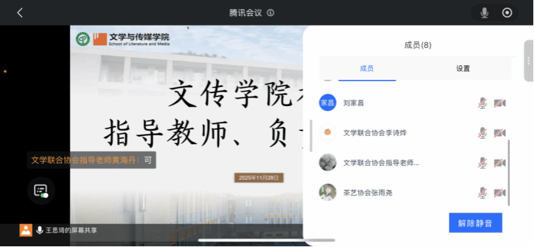 为深入落实立德树人根本任务,夯实学生社团育人阵地建设,进一步优化社团管理机制、提升社团活动精品化水平,2025年11月28日下午,文传学院团委以线上会议形式组织召开2025年下半年学生社团指导教师、社团负责人业务培训会。学院党委副书记刘家昌、团委副书记王思琦及文学协会、茶艺学会等全体社团指导教师、社团成员参会,会议由王思琪主持。