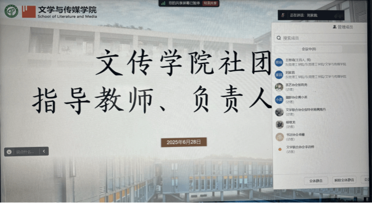 为深入贯彻全国教育大会精神,落实立德树人根本任务,进一步规范学生社团管理流程、提升社团活动质量,切实发挥社团育人功能,2025年6月28日下午,文传学院团委以线上会议形式组织召开2025年上半年学生社团指导教师、社团负责人业务培训会。学院党委副书记刘家昌、团委副书记王思琦及部分社团指导教师、社团负责人参会,会议由王思琦主持。